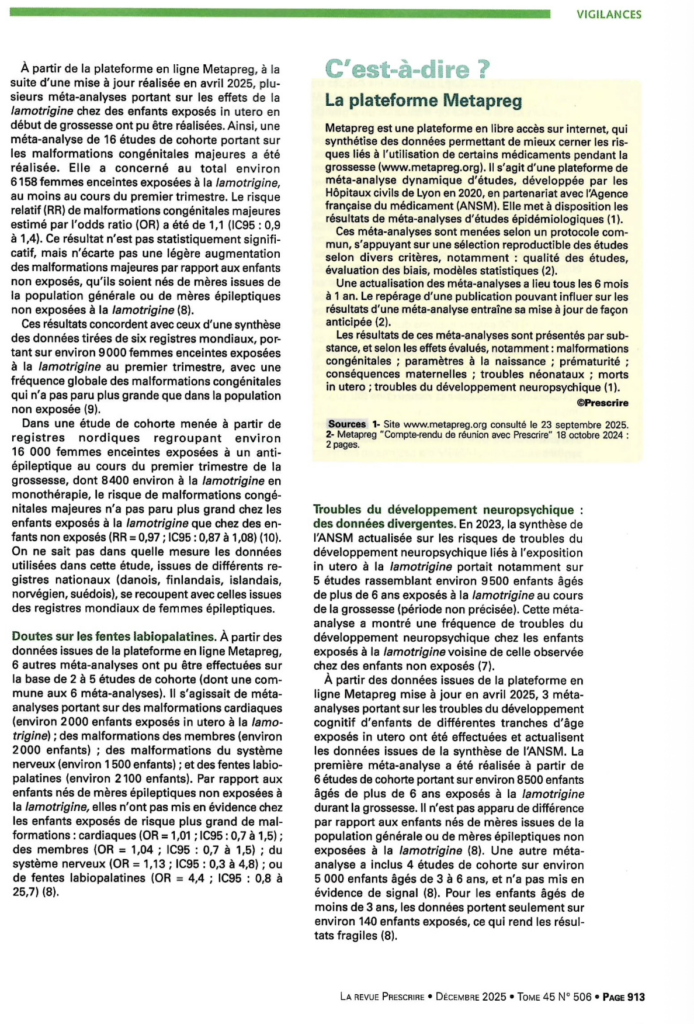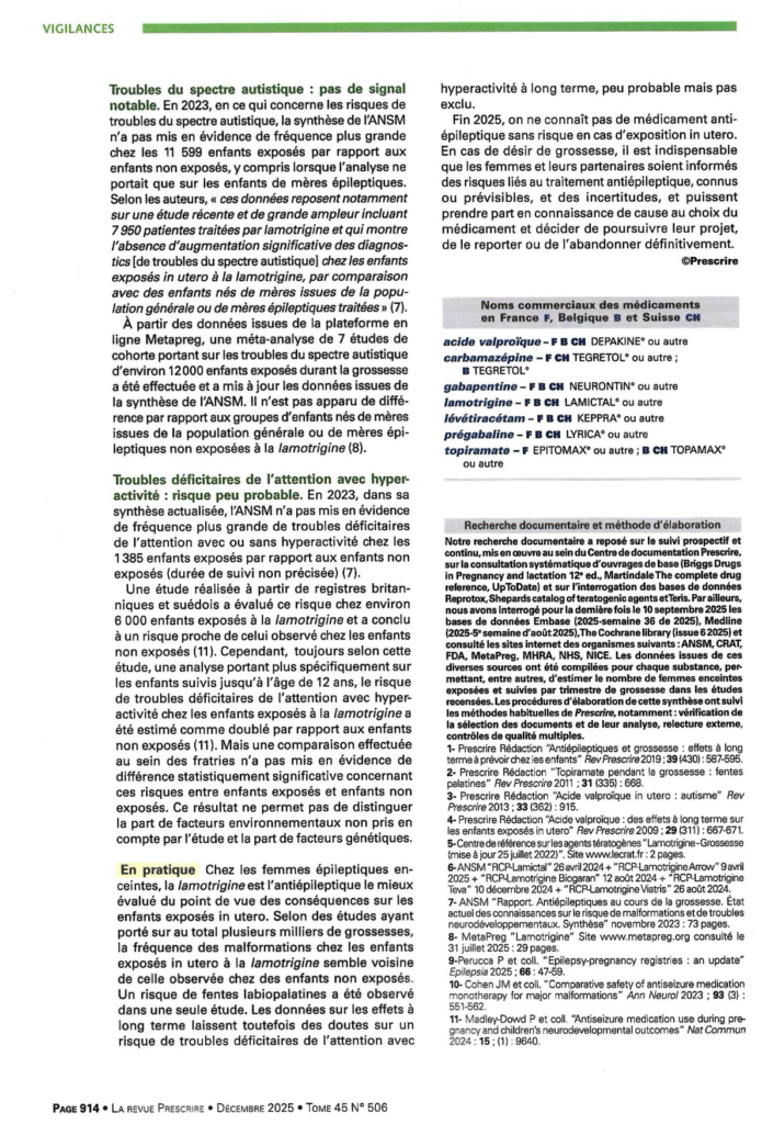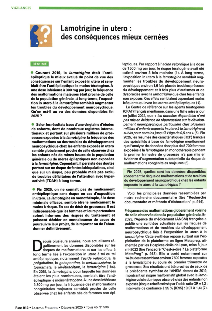 Le Centre de référence sur les agents tératogènes (CRAT) français mentionne, dans une fiche mise à jour en juillet 2022, que « les données disponibles n’ont pas mis en évidence de répercussion sur le développement neuropsychique particulière chez plusieurs milliers d’enfants exposés in utero à la lamotrigine et suivis pour certains jusqu’à l’âge de 9,5 ans » (5). Fin 2025, les résumés des caractéristiques (RCP) français des spécialités à base de lamotrigine mentionnent que l’analyse de données chez plus de 8 700 femmes exposées à la lamotrigine en monothérapie pendant le premier trimestre de grossesse n’a pas mis en évidence d’augmentation substantielle du risque de malformations congénitales majeures (6).