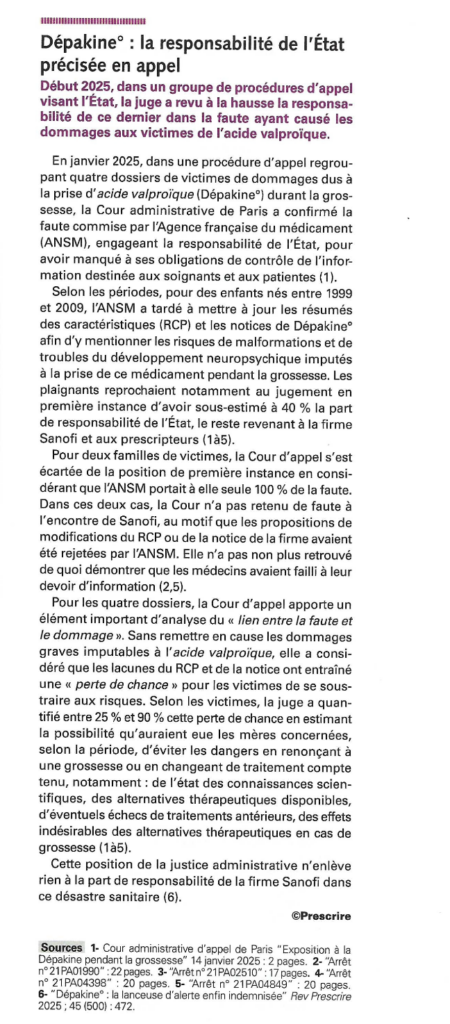 Début 2025, dans un groupe de procédures d’appel visant l’ Etat, la juge a revu à la hausse la responsabilité de ce dernier dans la faute ayant causé les dommages aux victimes de l’acide valproique