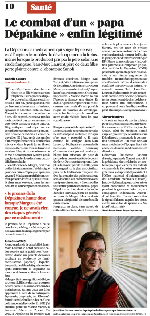 Jusqu’aux résultats, sans appel, de cette ultime étude, dont l’immense cohorte, la plus vaste sur le sujet en Europe, est un gage de sérieux concernant ses conclusions. Le 6 novembre dernier, le porteur de l’étude, le groupement d’intérêt scientifique EPI-Phare, annonçait que « l’exposition paternelle au valproate [le produit actif de la Dépakine, NDLR] pendant la spermatogenèse est associée à un risque augmenté de troubles neurodéveloppementaux chez l’enfant à naître ». « Cette étude a confirmé ma conviction intime, reconnaît aujourd’hui Jean-Marc Laurent. Et désormais je vais organiser la bataille, avec Apesac, pour alerter les pères, les médecins. Le laboratoire Sanofi m’a empoisonné, a empoisonné notre famille, mes filles peut-être sur plusieurs générations. »