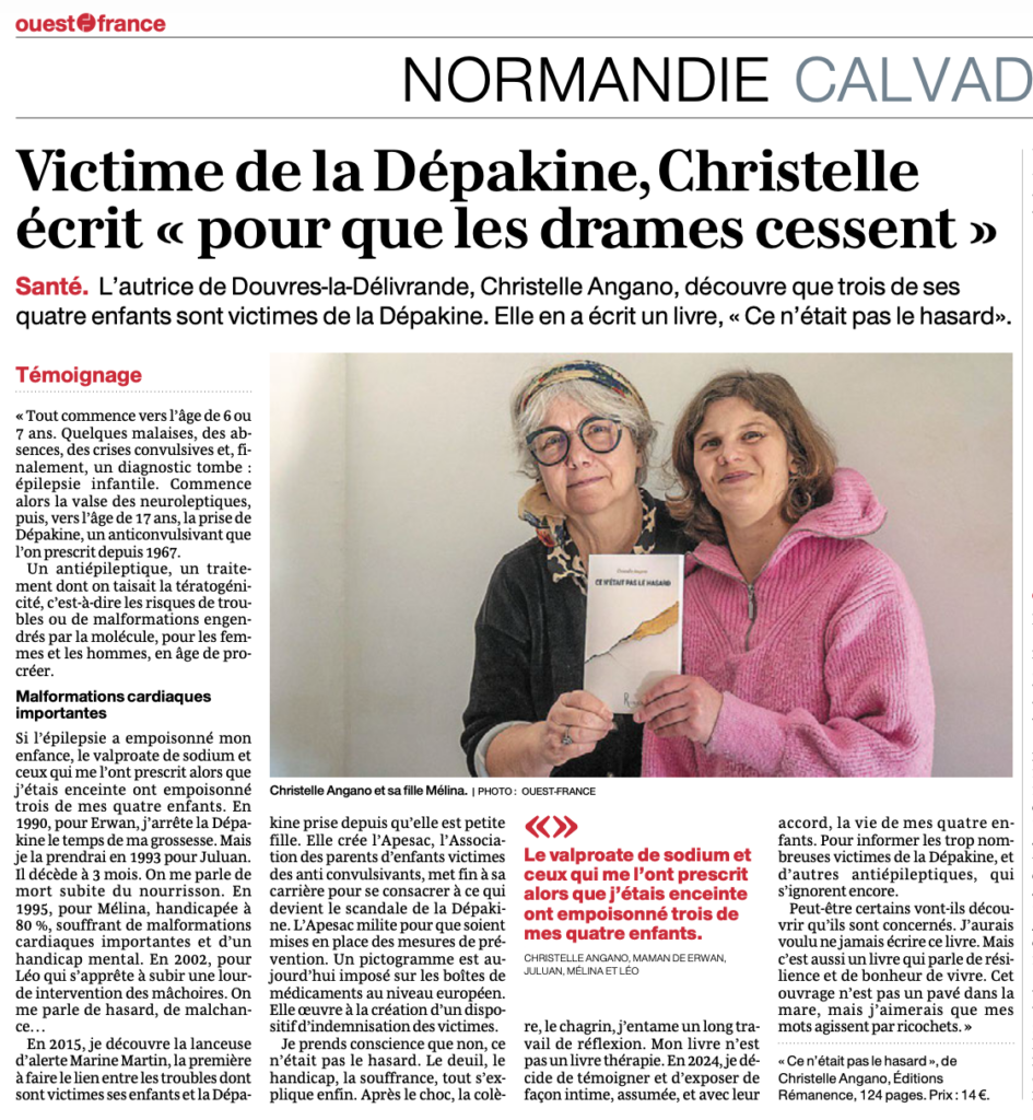 L’autrice de Douvres-la-Délivrande (Calvados) Christelle Angano découvre que trois de ses quatre enfants sont les victimes de la Dépakine, traitement qu’elle a pris pendant ses grossesses pour lutter contre ses crises d’épilepsie. Son livre est un cheminement intime, une quête de vérité, un combat.