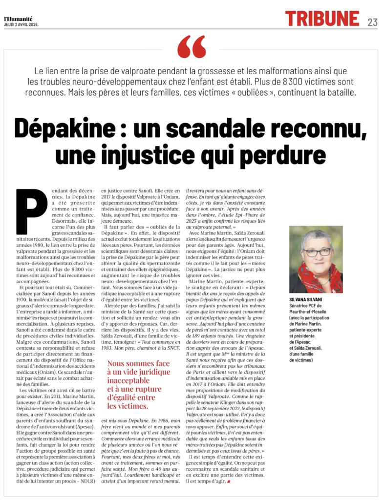 Le lien entre la prise de valproate pendant la grossesse et les malformations ainsi que les troubles neuro-développementaux chez l’enfant est établi. Plus de 8 300 victimes sont reconnues. Mais les pères et leurs familles, ces victimes « oubliées », continuent la bataille. Par Silvana Silvani, sénatrice PCF de Meurthe-et-Moselle, avec la participation de Marine Martin, patiente-experte et présidente de l’Apesac, et Saïda Zerouali, famille de victimes.